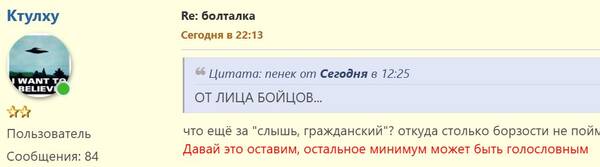 Цитата: Ктулху link=msg=15062 date=1771787599 Какое то быдло пошёл убивать украинцев за бабки, потом понял, что там не так всё красочно, как ему по зомбоящику напел Соловей и решил поскулить напоследок. Прекрасно...))) Все либералы с.... кхм ...свалили к Соне на форум.....по другую сторону баррикад.....испанская пыль все таки осела.