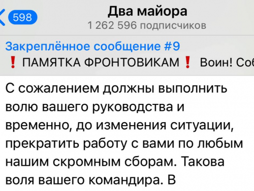 Отвечаю на вопрос Илье Ремеслу, который он поднял в моем чате, ( https://t.me/berloga_zov/288958) пытаясь прорекламировать там сборы Двух майоров: Почему я считаю сборы «Двух майоров» мошенническими? Людей же, которые против них мне свидетельствовали, он обвинил в обычных «волонтерских срачах». Дело не в волонтерских срачах, Илья, а в том, о чем вы и сами прекрасно знаете: Сейчас, когда Монтяно-Грубниковской сетке перекрыли кислород черной меткой экстремиста и террориста, и поступление средств опасны, их проверяют, как и расходование этих средств, то Би майоры - это *их (*подозреваю тут, как и вы до дружбы с Грубником, экстремистское сообщество) почти единственный оставшийся большой безопасный кошелек. Потому их и раскручивают по всем каналам и у вас Илья, новый друг Грубника, я сборы Двух Майоров раньше что-то не видела) Но о них знают, уверяю вас, не зря же командование морских пехотинцев запретило своим подразделениям принимать от них помощь. О чем сами же Два майора пишут (скрин) Мои вопросы Илье ( https://t.me/ilya_remeslaw) : 1. Знаете ли вы, размещая их сборы, что командование морских пехотинцев запретило пехотинцам что-либо у Двух майоров принимать? При этом сбор они никак не остановят. 2. Как думаете, почему запретили брать гумпомощь у целого круга срочносборщиков? 3. Почему сборы Двух Майоров массово, даже после этого, репостят Монтян, Ремесло и другие очень «уважаемые каналы». 4. Почему Два майора не приняли приглашение Соловьева, чтобы разобраться в вопросе запрета им оказывать помощь нашим подразделениям? Мой ответ на этот вопрос здесь ( https://t.me/berloga_zov/289119). ( https://t.me/berloga_zov/289119) 5. Как размещение этих сборов монтяновской сетки бьется с вашим же постом ( https://t.me/grafynia/41654)(одним из многочисленных) об этом же самом сообществе? 6. Почему сборы двух майоров появились у вас только сейчас, после того как вы «подружились» с Грубником *Монтян внесена в список экстремистов и террористов в РФ P.S Надеюсь, Илье-то можно неудобные вопросы задавать, без угроз «шагов на лестнице», как обычно) Впрочем, я бы и с угрозами задала. А угрозы уже поступали. ( https://t.me/ilya_remeslaw/9745) https://t.me/grafynia/41657?single
