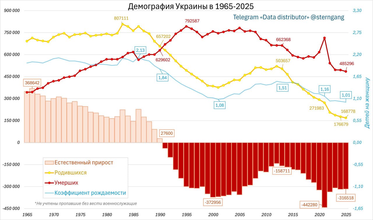 1. По итогом 2025 года число рождений на территории бывшей УССР снизилось со 176,6 тыс. до 168,7 тыс. Перед распадом Союза на территории УССР рождалось до ~800 тыс. детей в год.