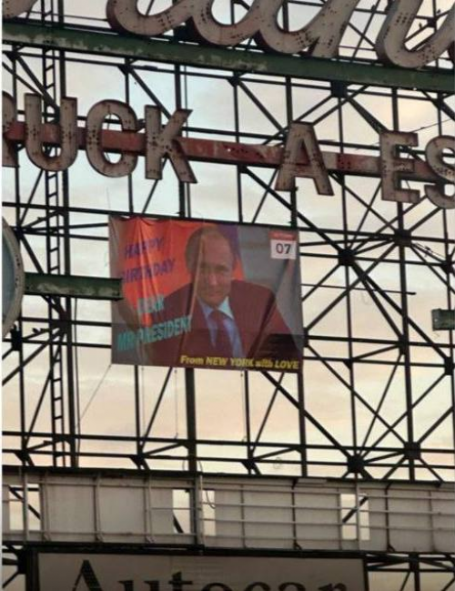 Плакат с поздравлением Путина появился сегодня на самой загруженной трассе Белт-Паркуэй в городе Нью-Йорк: