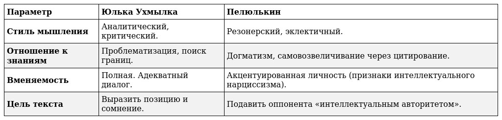 •  Вердикт: Пелюлькин использует имена философов как «магические заклинания» для придания веса собственным измышлениям. Он жонглирует терминами, не заботясь о том, что идеи Фреге и Гуссерля во многом противоположны его тезисам об «интуиции».