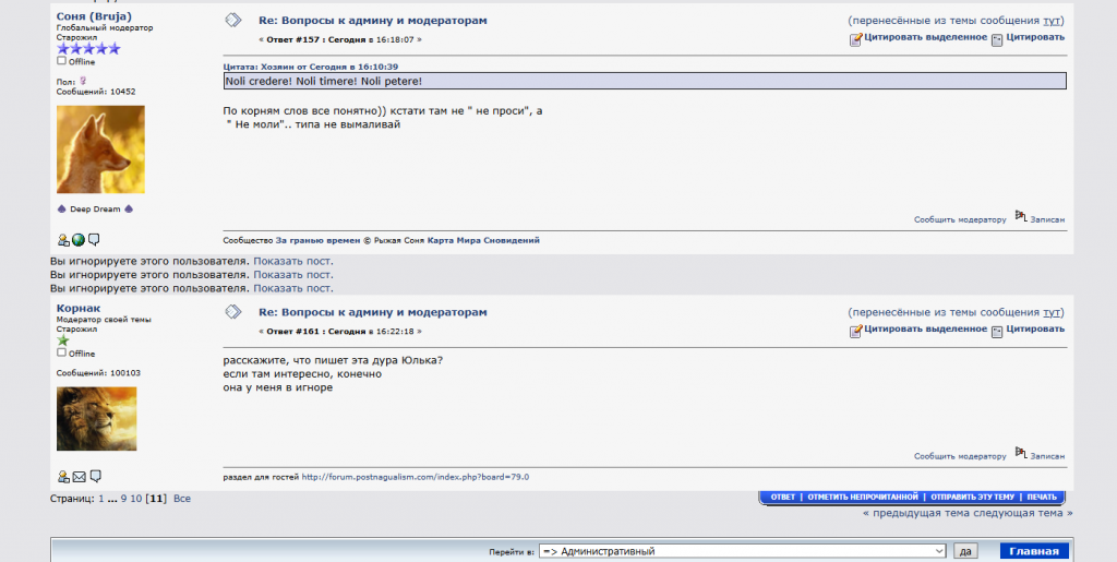 Не хочет Юля мне плевать, что вы с этой ××××××× хотите, или не хотите я имею право критиковать и никто не имеет право забирать посты в моей теме вот и всё, что вам обеми нужно знать Корни клоун, у тебя от старческого маразма совсем обнулилась логика, хотя я не уверена что ты ей когда либо обладал -- ты бредишь что никто не имеет права забирать посты в чужой теме -- так ведь это и есть то, чем ты много раз занимался в моих темах и в моем разделе -- забирал из него свои посты прямиком в утилизацию, то есть в скрытую корзину куда сбрасывается вся удаленка -- и ты это знаешь. Так что корни клоун пересмотри свои идиотские взгляды и требования -- иначе тебе придется вернуть все то что ты в моих темах поудалял, а это таки возможно сделать администратору Пипе.